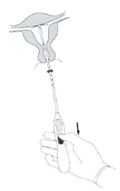 4. Продолжая удерживать бегунок в самом дальнем положении, продвигайте проводник осторожно через цервикальный канал в матку до тех пор, пока указательное кольцо не окажется на расстоянии около 1,5-2 см от шейки матки (Рисунок 4).